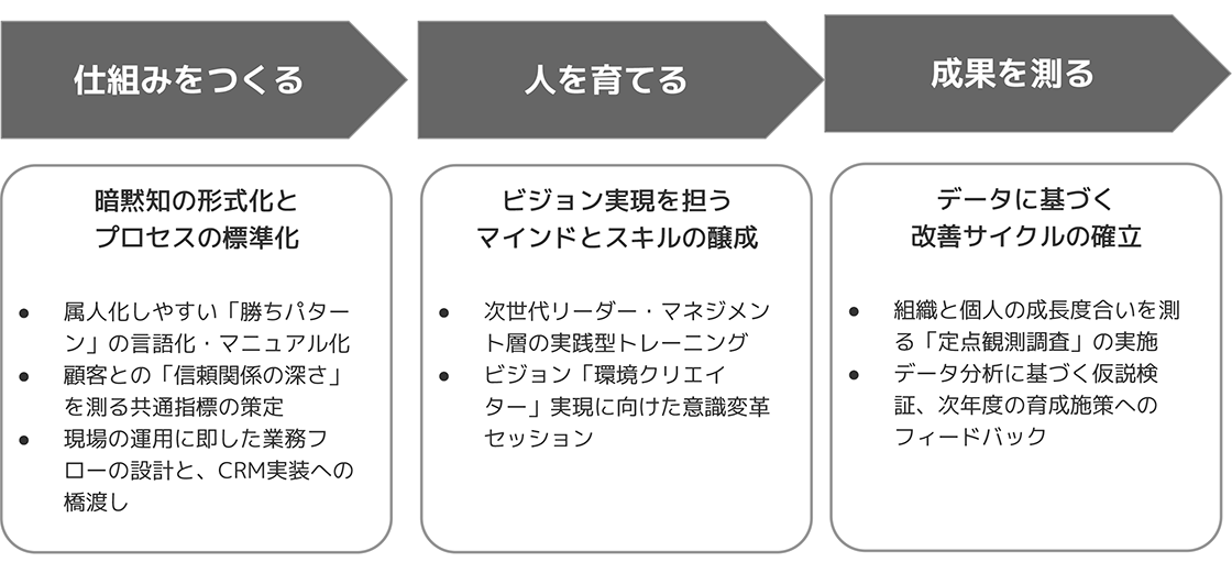マニュアル化、CRM実装、評価制度との連携により戦略を現場の行動まで落とし込みました。