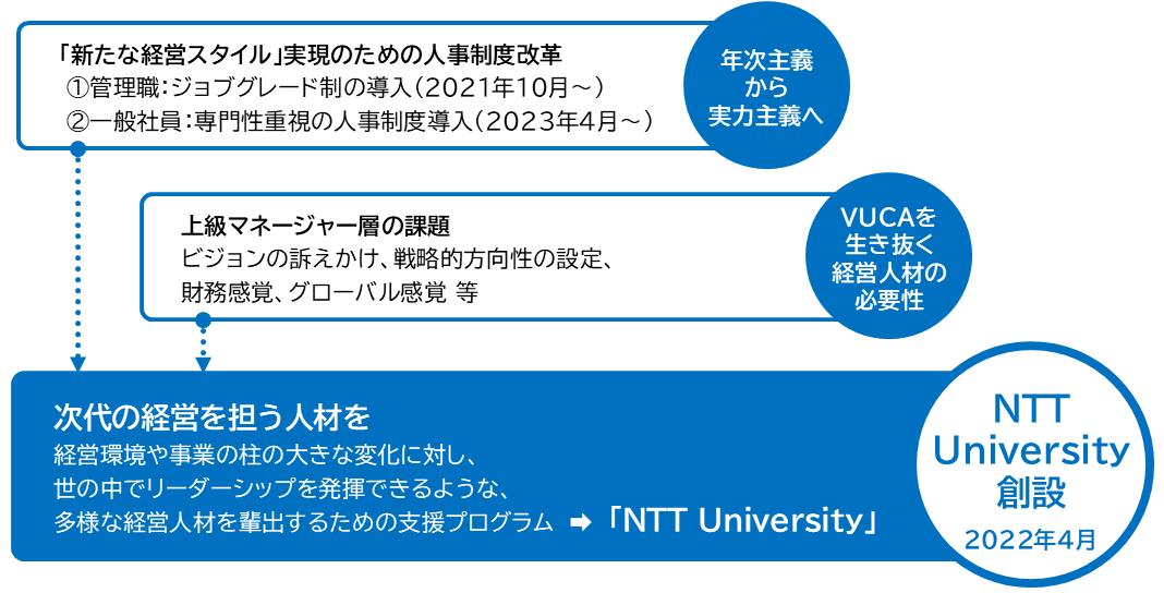 その中で上級マネージャーにはビジョンを描き周囲を動かす力が求められており、これらを備えた次世代の経営人材を育てる場としてNTT Universityが位置づけられています。
