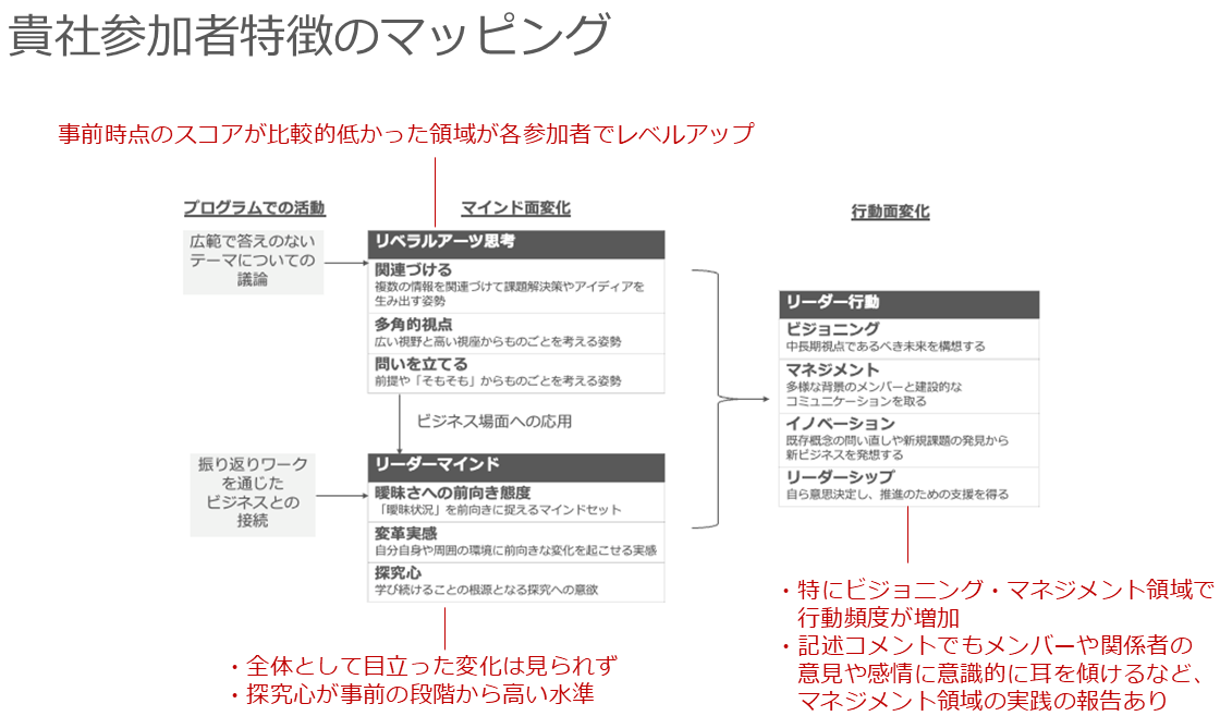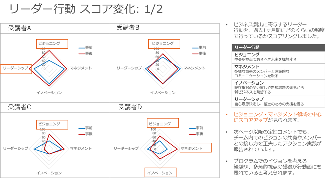 特に、ビジョニングやイノベーションといったリーダー行動のスコアが向上している点は、研修の大きな成果として評価されています。