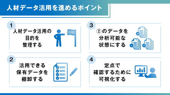 ピープルアナリティクスを導入し進めていくためには、これらの課題に対処していく必要があります。しかし、「分析したいができていない」企業の方にとっては、大きな壁に感じるかもしれません。こうした壁に対しては、いきなり大きな手立てを打とうとするのではなく、ステップを踏みながら着実に進めていくことが効果的です。そこで、ピープルアナリティクスの導入に際して、何から手を付ければいいのかを、4つのポイントで解説します。