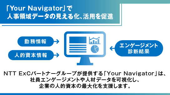 NTT ExCパートナーグループが提供する「Your Navigator」は、社員エンゲージメントや人材データを可視化し、企業の人的資本を支える戦略立案・施策す本コラムでは、人事領域のデータ活用について、ピープルアナリティクスという概念やそのメリット、課題、人事領域でのデータを分析して活用したいものの着手できていない企業に向けたその進め方とポイントをご説明しています。意向をサポートするサービスです。人事担当者の業務負担を増やすことなく、人的資本分野に関わる複合情報(健康情報、人的情報、エンゲージメント等)を分析・可視化し、真の課題把握にも活用できるので、企業の「分析したいけれど、できない」というお悩みを解決します。