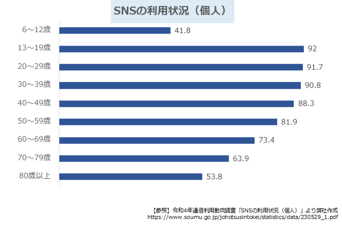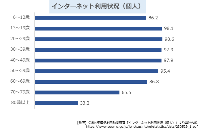 ネット利用率は、60代で9割、70代も3人に2人が利用しています