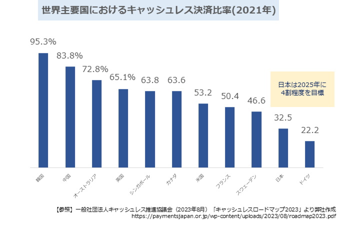 日本のキャッシュレス決済比率は増加しているものの、世界規模で見た場合、圧倒的に高い韓国や中国に比べると、まだまだ日本は低いことが分かります