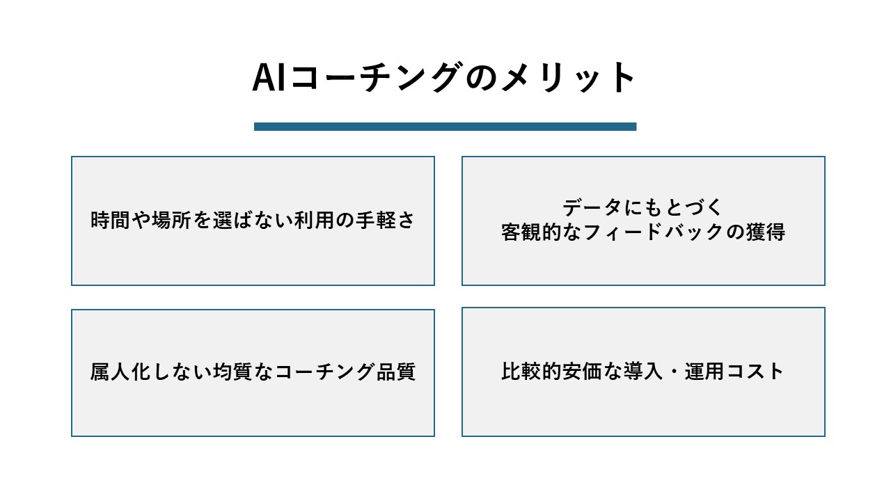 専門のコーチを外部から雇う場合、高額な費用がかかることが一般的です。それに対して、AIコーチングサービスは、比較的低コストで多くの従業員に導入することが可能です。これまでコストの観点からコーチングの導入が難しかった企業でも、全社的な人材育成施策として展開しやすくなります。