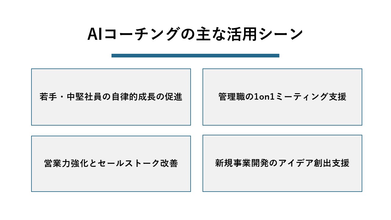 AIコーチングは、様々なビジネスシーンでその効果を発揮します。ここでは、代表的な活用シーンをいくつか紹介します。