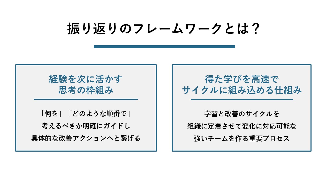 振り返りのフレームワークとは、個人やチームが経験から学び、次のアクションに繋げるための「思考の枠組み」や「手順」を体系立てたものです。決められた型に沿って進めることで、議論が脱線したり、単なる反省会で終わったりするのを防ぎ、建設的な対話を通じて改善策を見出すことを目的とします。