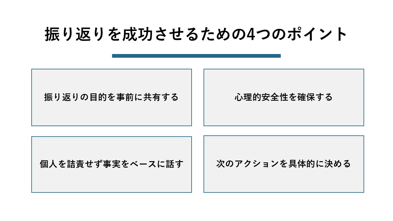 どのフレームワークを選ぶかも重要ですが、振り返りの場をいかに有意義なものにするかも同じくらい大切です。ここでは、振り返りを成功に導くための4つの基本的なポイントを紹介します。