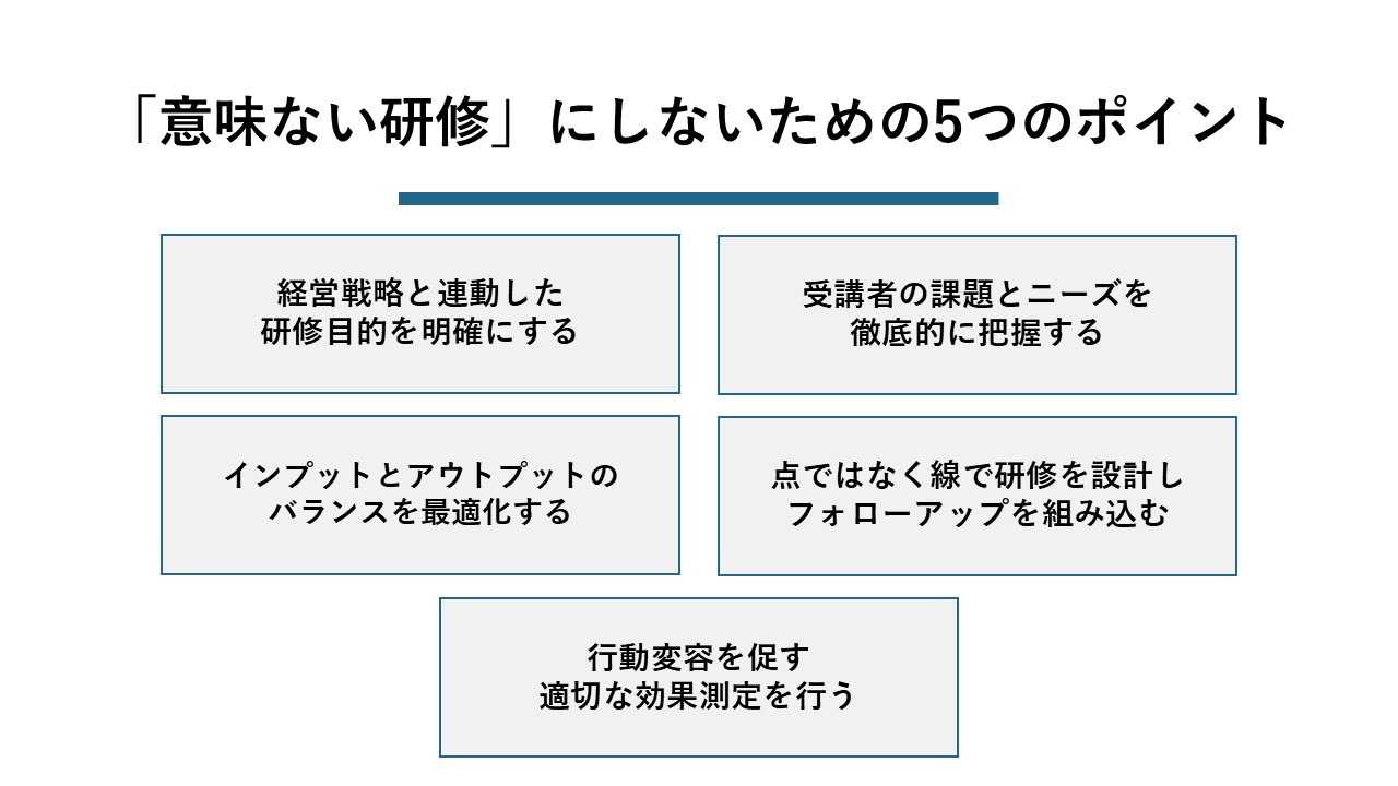 管理職研修が「意味ない」と言われる原因を避けるためには、研修の企画から効果測定までを一貫したプロセスとして捉え、戦略的に設計することが重要です。ここでは、研修の成果を最大化するための5つのポイントを解説します。