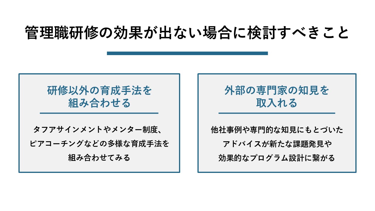 これまでにご紹介したポイントを実践しても、管理職の育成に課題が残る場合、研修という手法だけでなく、より広い視野で対策を考える必要があります。