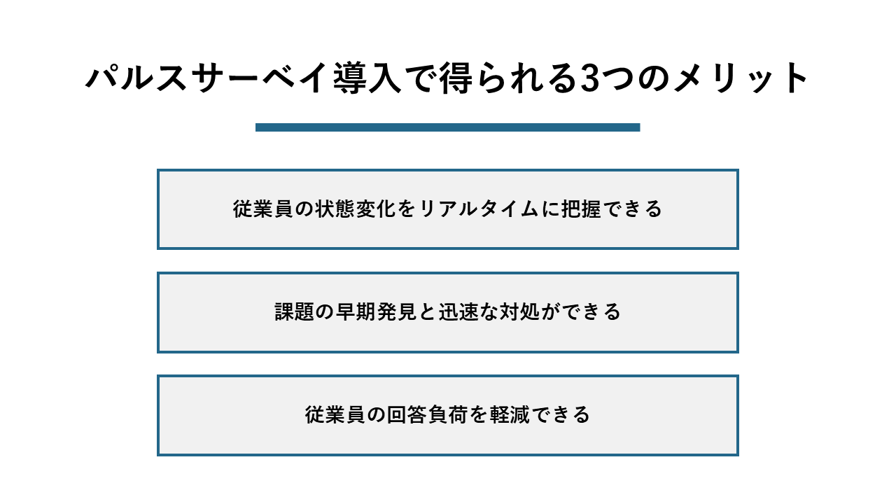 多くの企業がパルスサーベイを導入する背景には、従来の手法では解決しづらかった課題を解消できるメリットがあります。ここでは、導入によって得られる主な3つの効果について解説します。