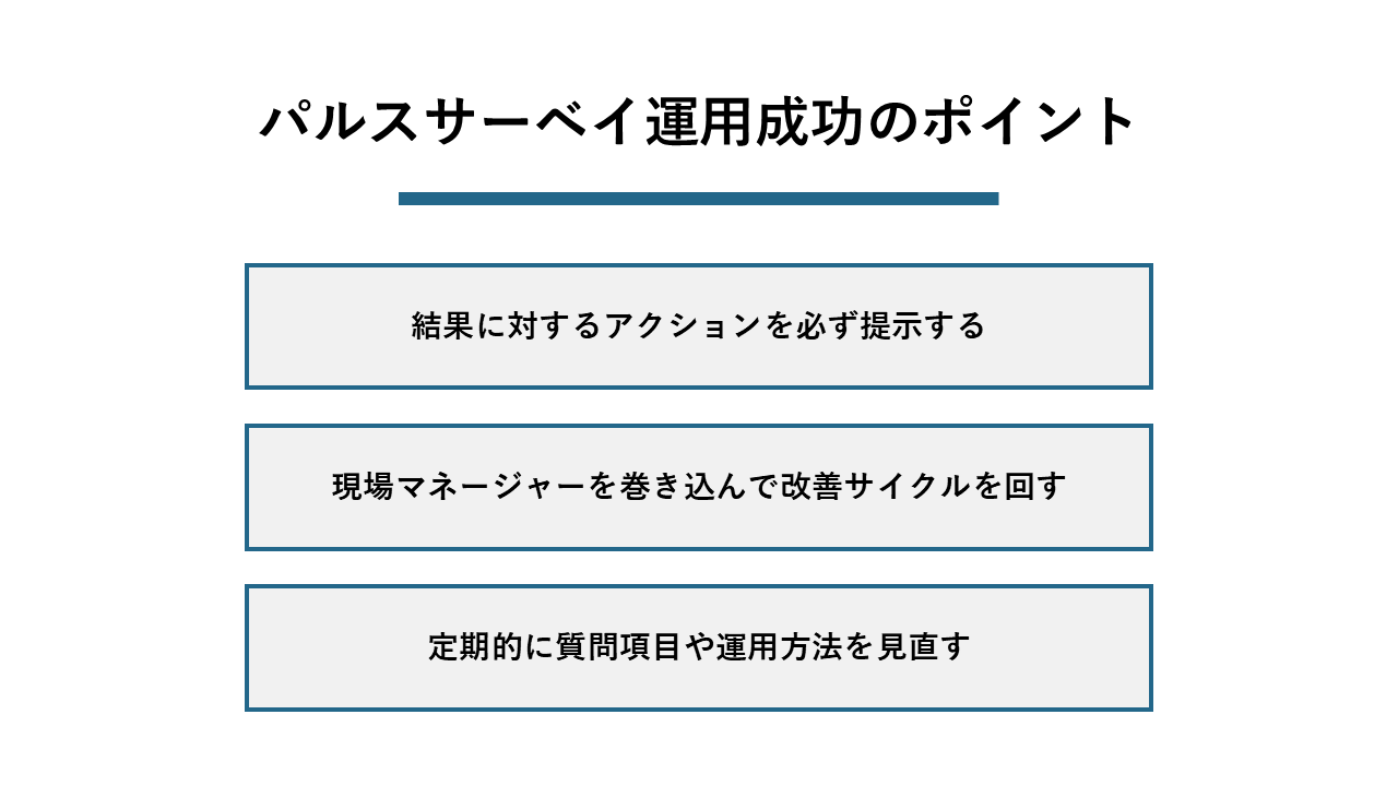 組織の状態や課題は時間とともに変化します。一度設定した質問項目を漫然と続けるのではなく、半年に一度などのタイミングで項目の見直しを行いましょう。また、回答率が低下してきた場合は、実施頻度や質問数、周知の方法などを再検討し、常に運用をブラッシュアップしていく姿勢が求められます。