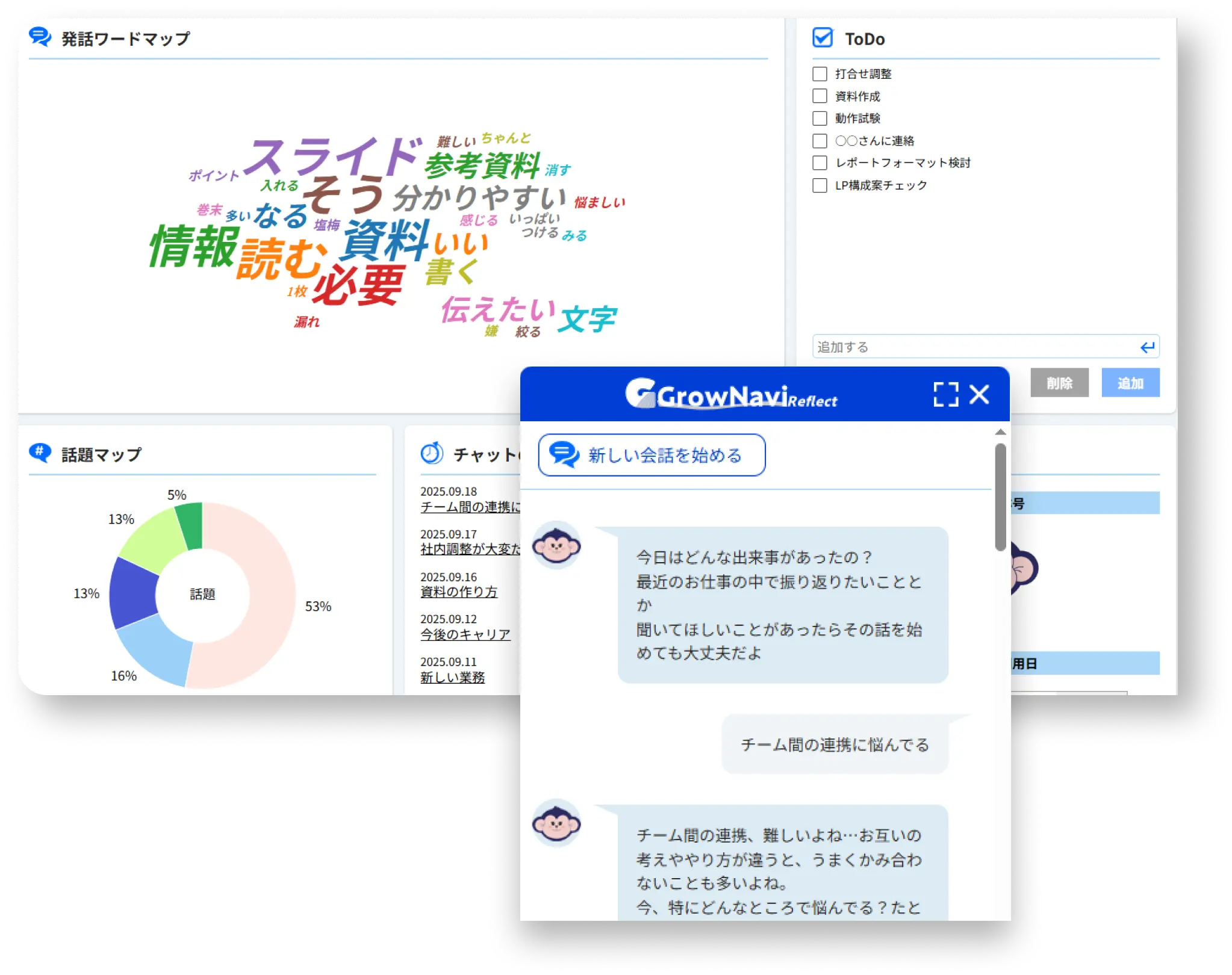 GrowNavi Reflectは、内省支援AIサービスとして、従業員が日々の業務や悩みをAIに語りかけることで、客観的な視点や改善提案を得られるよう設計されています。これは、単なる「答えを与えるAI」ではなく、自分自身の気づきを促すAIとして位置づけられています。