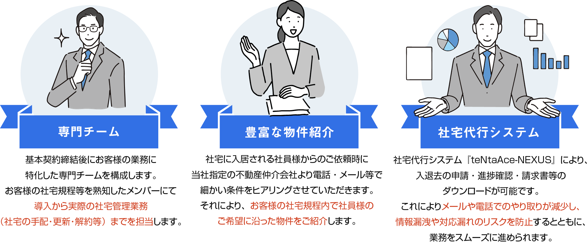 NTT ExCパートナーは「専門チーム」 を軸に、「システム」による安心の一元管理や提携仲介からの「豊富な物件紹介」をいたします。
