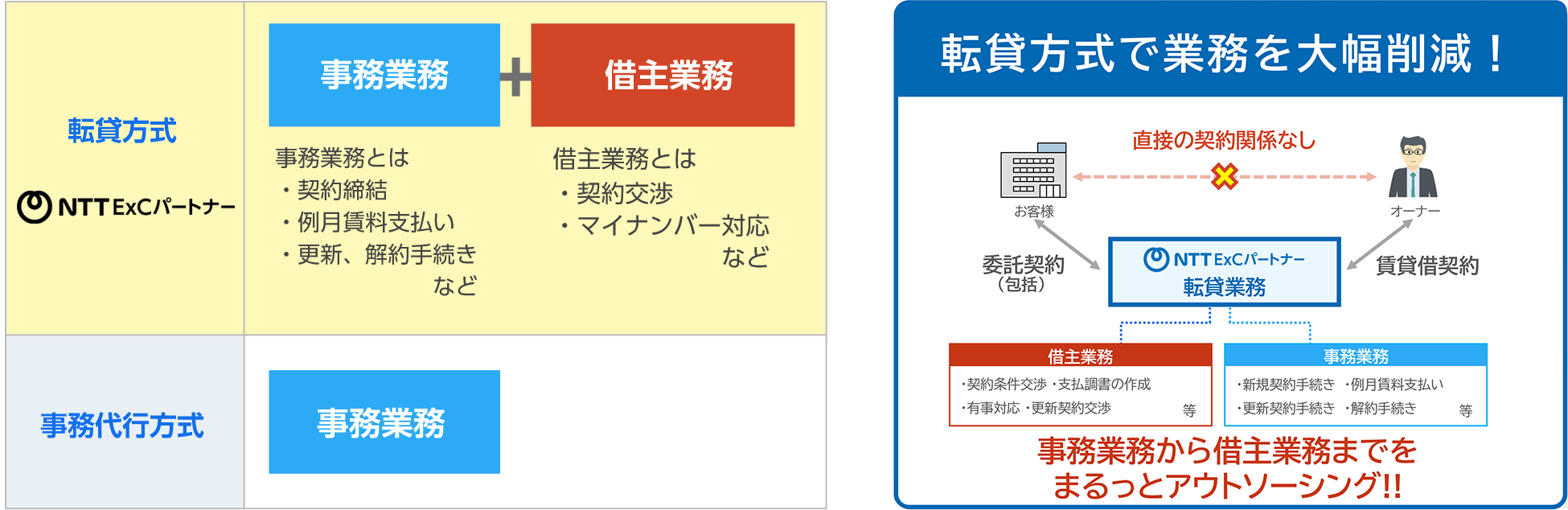 「転貸方式」は、委託会社が借主となり、「事務業務」と「借主業務」にあたるため、ほぼ全ての業を委託することができます。
