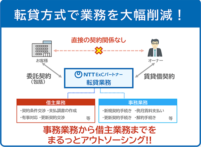 「転貸方式」では、上記の「事務業務」に加えて、契約・更新・解約条件交渉や有事対応等の「借主業務」についても代行することが可能なため、「事務代行方式」よりも幅広くお客様をサポートできるかつ、お客様のリスク削減も可能です。