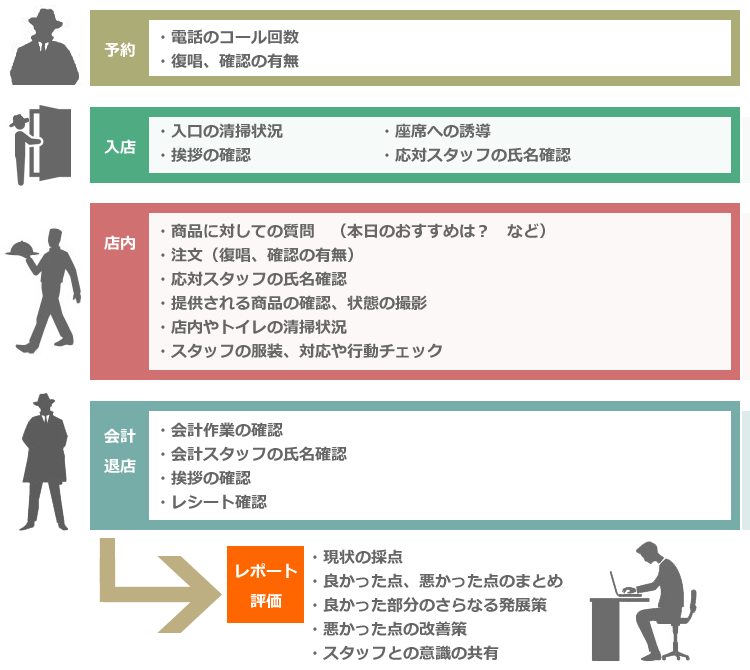覆面調査(ミステリショッパー)では調査員が一顧客を装い、店舗フロアーや、レジなどでの、顧客接点における現場のリアルな実態を調査します。