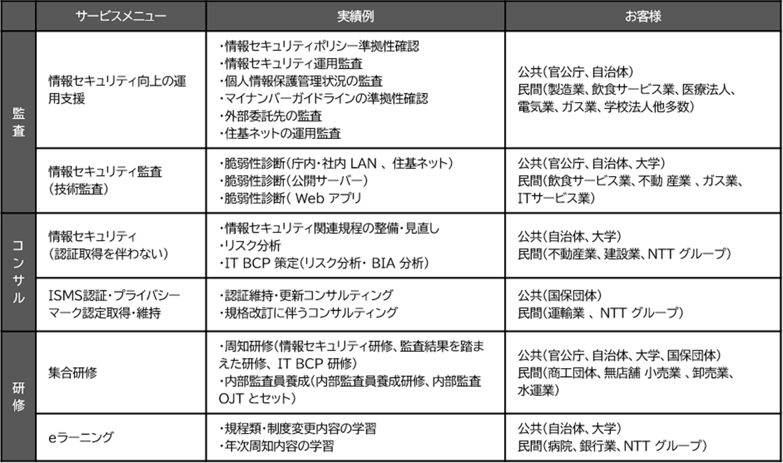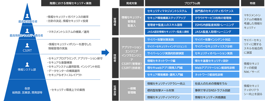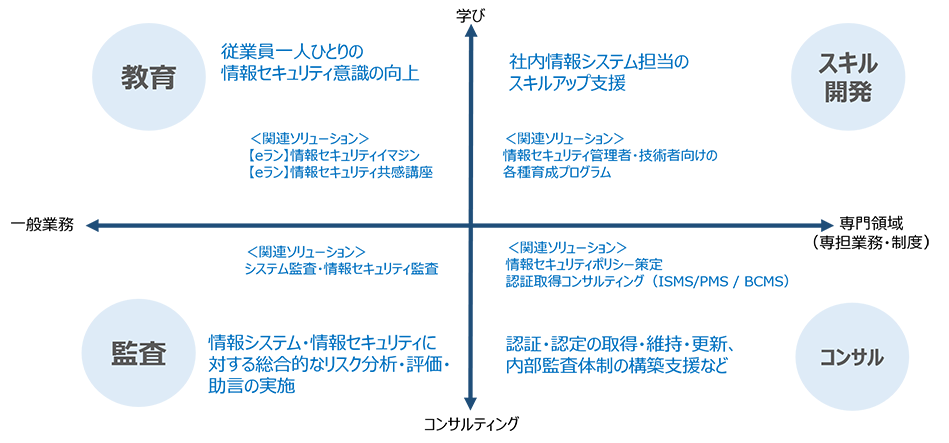 | 内容 | 教育・スキル開発・監査・コンサルティングのすべての観点から、お客さま企業に最適な対策を提案。会社全体の情報セキュリティリテラシー向上に向けた人材育成も支援。 |