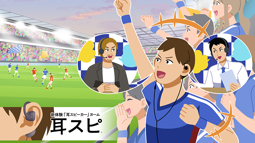 NTTコンピュータ&データサイエンス研究所が研究を進めている、PSZ(パーソナライズドサウンドゾーン)技術搭載したオープンイヤー型イヤホンを使い、スタジアムの臨場感はそのままに、音声解説や空間音響コンテンツを耳元から再生することで、サッカーをより分かりやすく、より楽しく観戦できる新たな体験を生み出しました。