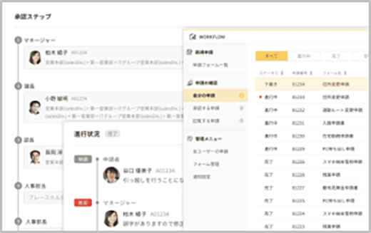 評価シートの集約はもちろんのこと、今まで紙とハンコで行っていた社員からの身上申請をワークフローで効率化できます。申請の入力欄やワークフローは自由にカスタマイズできるため、会社独自の制度に合わせた使い方ができます。
