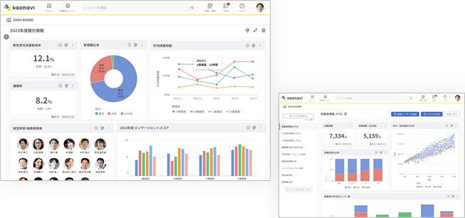 ・カオナビにある人材のデータをダッシュボード上にグラフで可視化し、経営や人事戦略上、重要なKPIをグラフで定点観測できるため、先手での人事施策を策定、実施することができます。 ・人材にひもづくデータはすべてカオナビにまとめられるため、いままで感覚的だった配置検討が、ファクトデータに基づき実施可能です。 ・パルスサーベイやアンケートで社員の不満や満足を可視化し、エンゲージメント向上施策検討に活用できます。