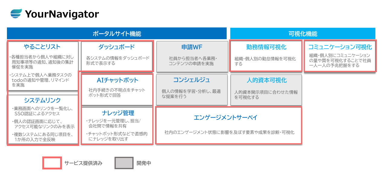 | 提供サービス | 様々なシステムの人財データを一元管理するプラットフォーム「Your Navigator」の提供(ポータルサイト機能・可視化機能) |