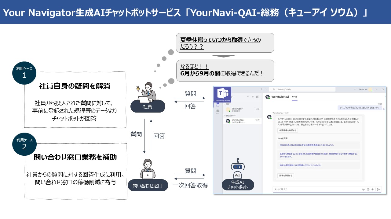 | 提供サービス | 社内問い合わせ業務対応の生成AIチャットボットサービス(環境構築から導入後の運用支援までトータルサポート) |