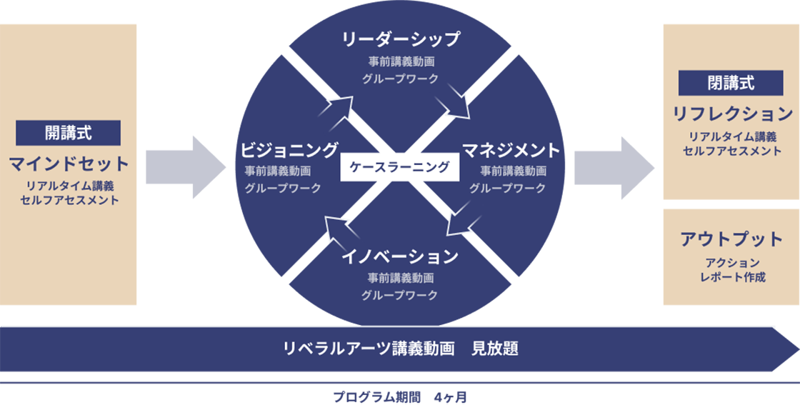 リベラルアーツ講義動画と次世代リーダー同士でのグループワークを通じ、4か月で管理職に求められる「問いを立てる力」や「関連付ける力」を養うプログラムです。